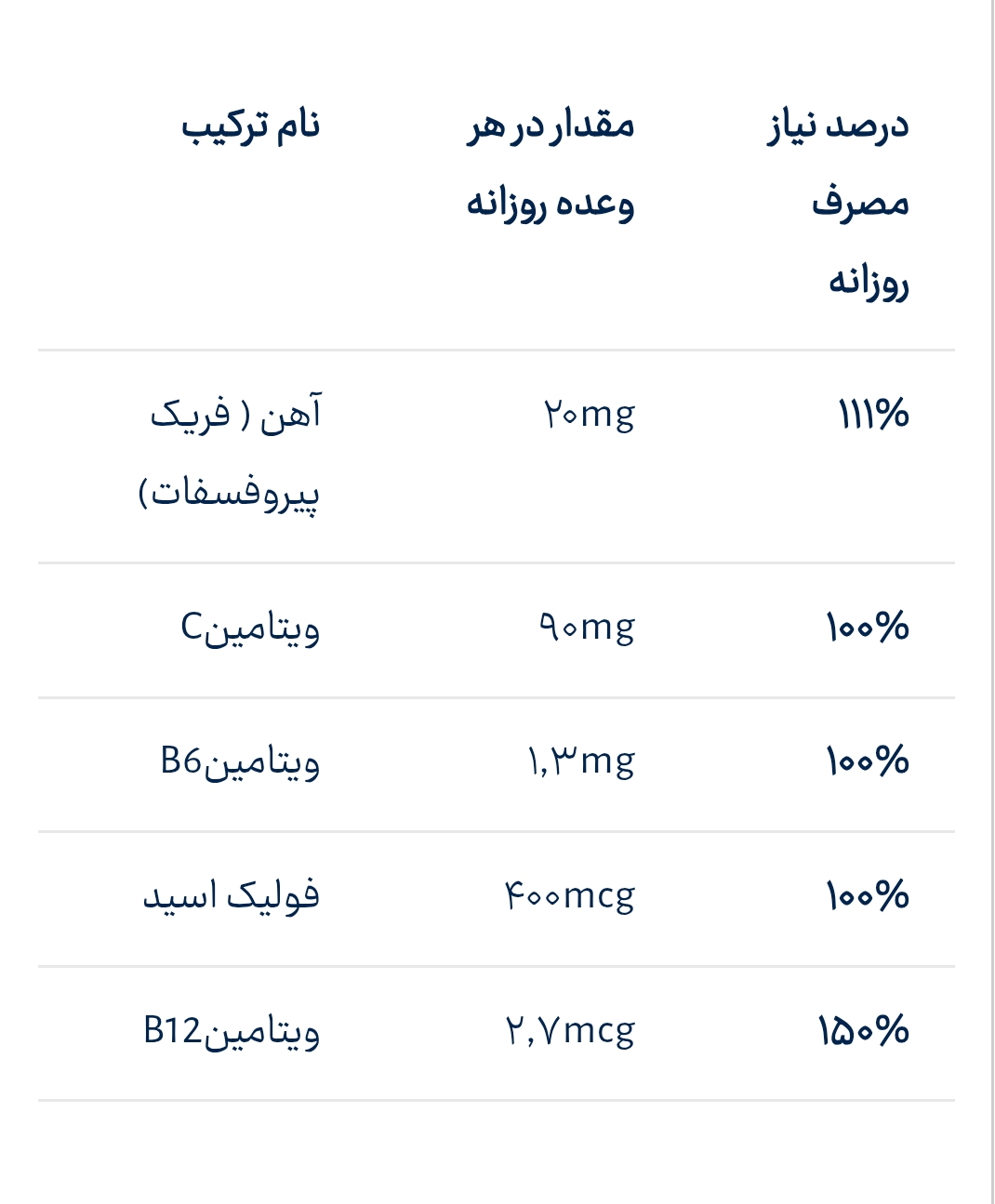 دارای آهن لیپوزومال و دارای قابلیت جذب بسیار بالا با کمترین عارضه گوارشی مانند تهوع و یبوست