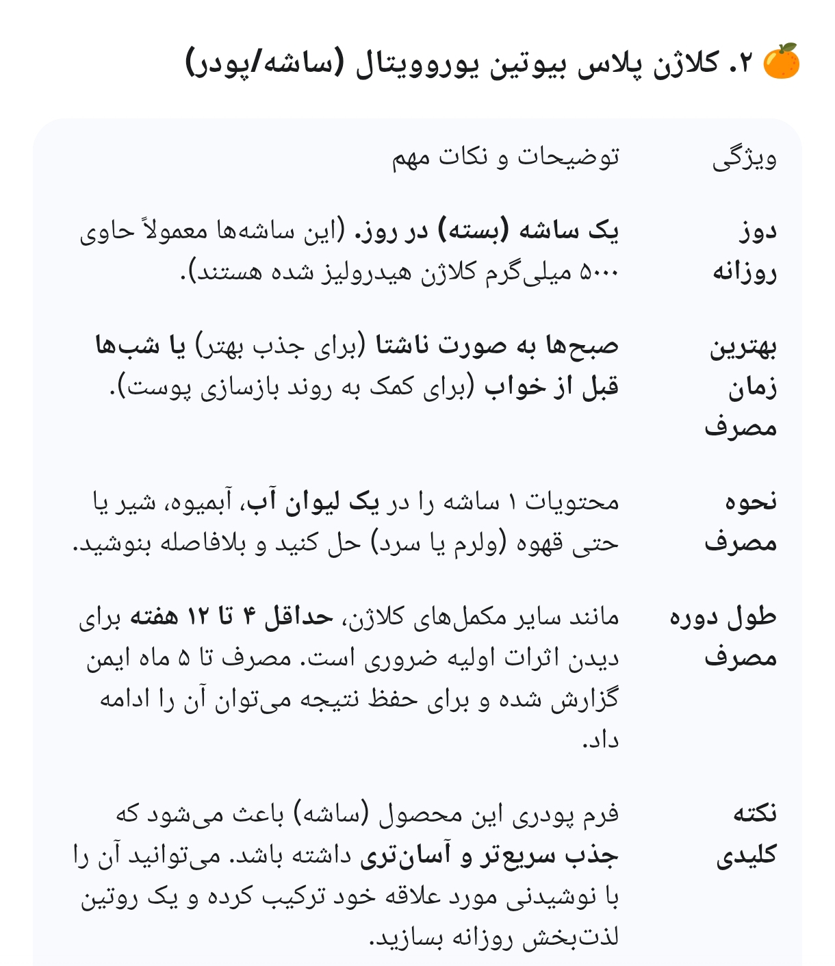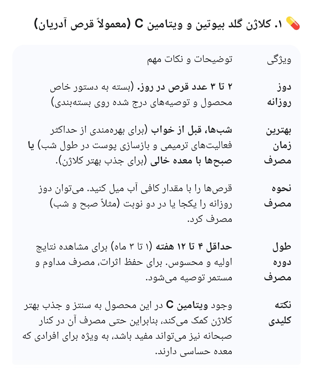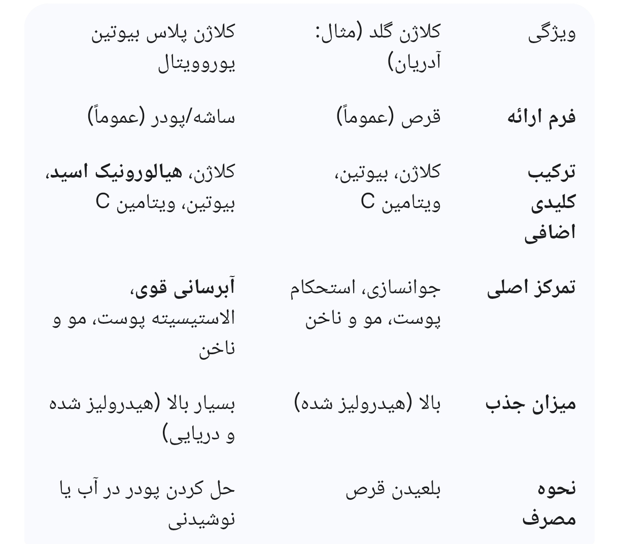نکته پایانی: هر دو محصول حاوی کلاژن هیدرولیز شده هستند که جذب بالایی دارد. مهمترین عامل در اثربخشی این مکملها، مصرف مداوم و حداقل به مدت 4 تا 12 هفته است. همچنین، قبل از شروع هرگونه مکمل جدید، مشورت با پزشک یا داروساز توصیه میشود.