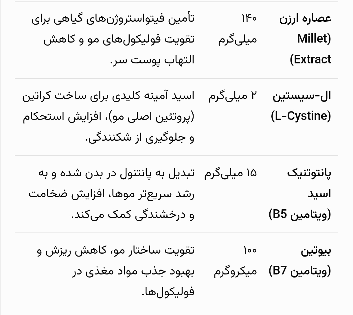 کاهش ریزش مو: تا ۷۰٪ کاهش ریزش پس از ۳ ماه مصرف، به ویژه در موارد ارثی و هورمونی.