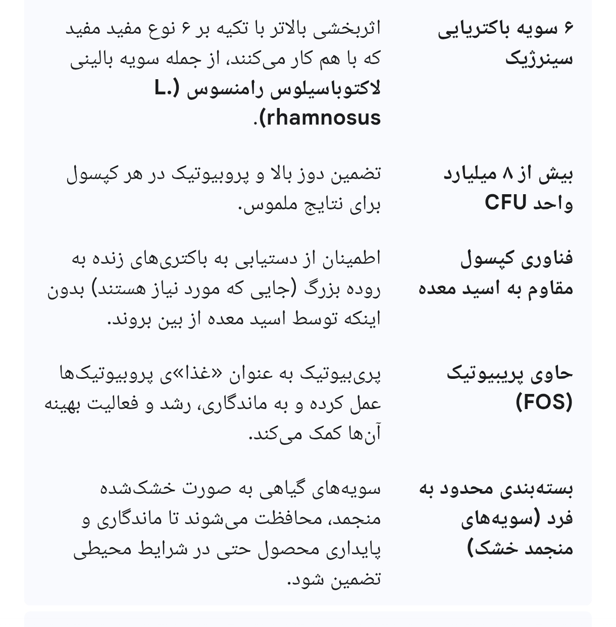 • حاوی ۶ سویه سینرژیک از جمله لاکتوباسیلوس رامنوسوس مورد مطالعه بالینی