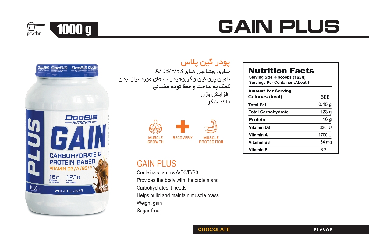 پودر گین پلاس دوبیسپودر گین پلاس دوبیس با تامین پروتئین و کربوهیدرات مورد نیاز بدن به تامین انرژی، افزایش وزن و حجم عضلات کمک می‌کند. این مکمل یک گزینه مناسب برای افرادی است که به سختی وزن اضافه می‌کنند و در تامین کالری مورد نیاز بدن موثر است.این پودر به عنوان کمک کننده به تامین پروتئین و کربوهیدرات‌های مورد نیاز در حین ورزش، ورزشکاران مورد استفاده قرار می‌گیرد و با نسبت مناسب به افزایش وزن و حجم عضلانی کمک می‌کند. هر سروینگ از این محصول که معادل 4 پیمانه است، حاوی 165 گرم پودر گینر است که حاوی 588 کیلوکالری انرژی است. این مقدار کالری دریافتی به علاوه رژیم غذایی مناسب، به طور موثری باعث افزایش وزن و عضلات می‌شود و در بهبود ریکاوری موثر است