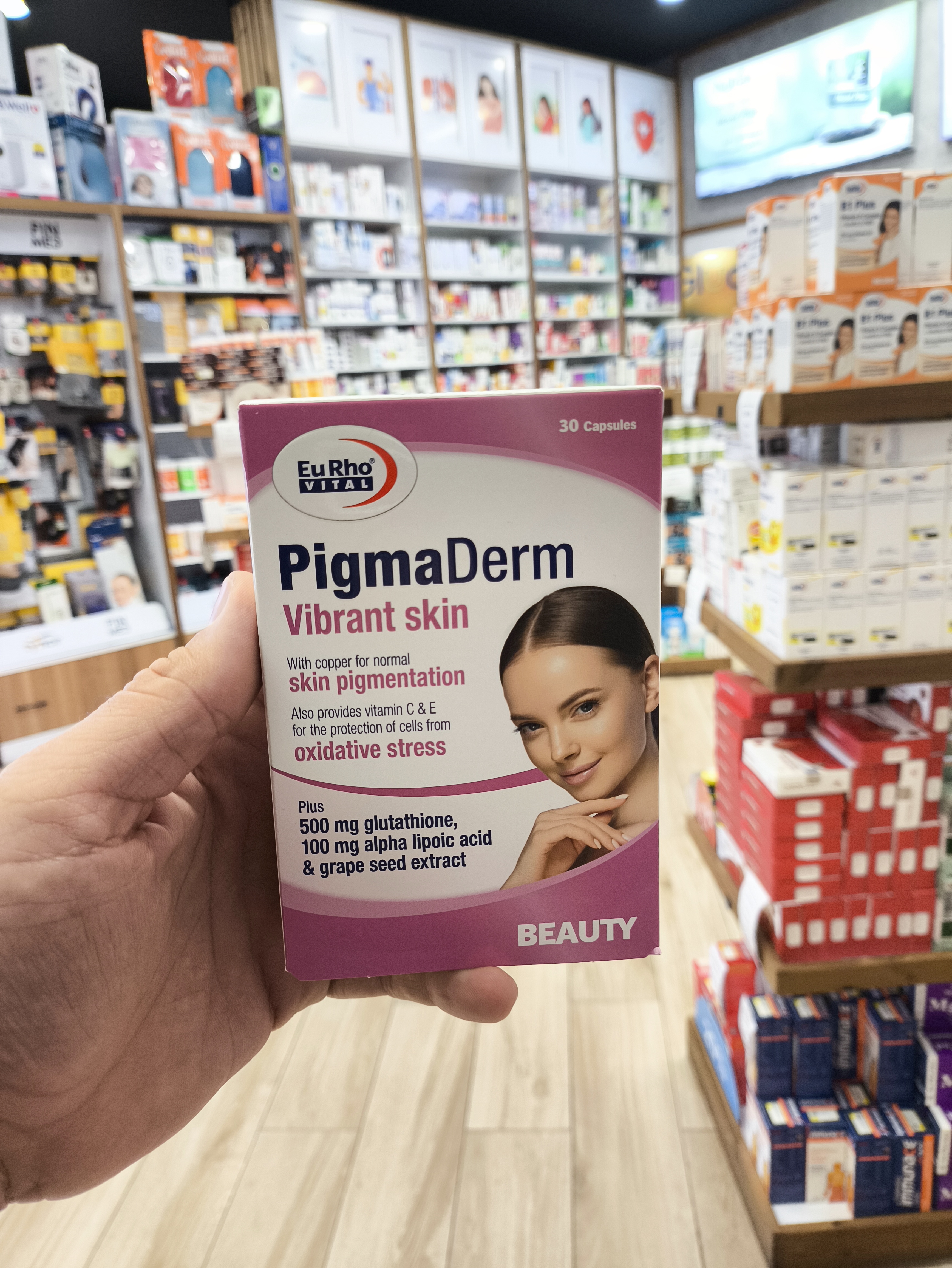 عوامل مختلفی از جمله اشعه ماورا بنفش خورشید، افزایش سن، استرس و مصرف غذاهای ناسالم و فرآوری شده باعث تیره شدن پوست، بروز لکها و چین و چروکهای پوستی میشود. ترکیبات آنتیاکسیدانی به روشن شدن پوست، از بین رفتن لکهای پوستی و ترمیم پوست کمک میکنند. کپسول پیگمادرم یوروویتال حاوی ال-گلوتاتیون، عصاره هسته انگور، آلفا لیپوئیک اسید، ویتامینهای E و C، نیاسین و مس است که اثرات مثبتی در شادابی و سلامت پوست، مو و ناخن دارد.