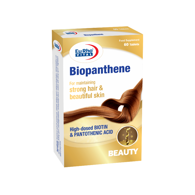 قرص بیوپانتن یوروویتال حاوی 5000 میکروگرم بیوتین و 100 میلی‌گرم پانتوتنیک اسید، تامین کننده دوز بالای بیوتین و پانتوتنیک اسید است که به پرپشت شدن موها، احیای پوست و سفتی ناخن‌ها کمک می‌کند.