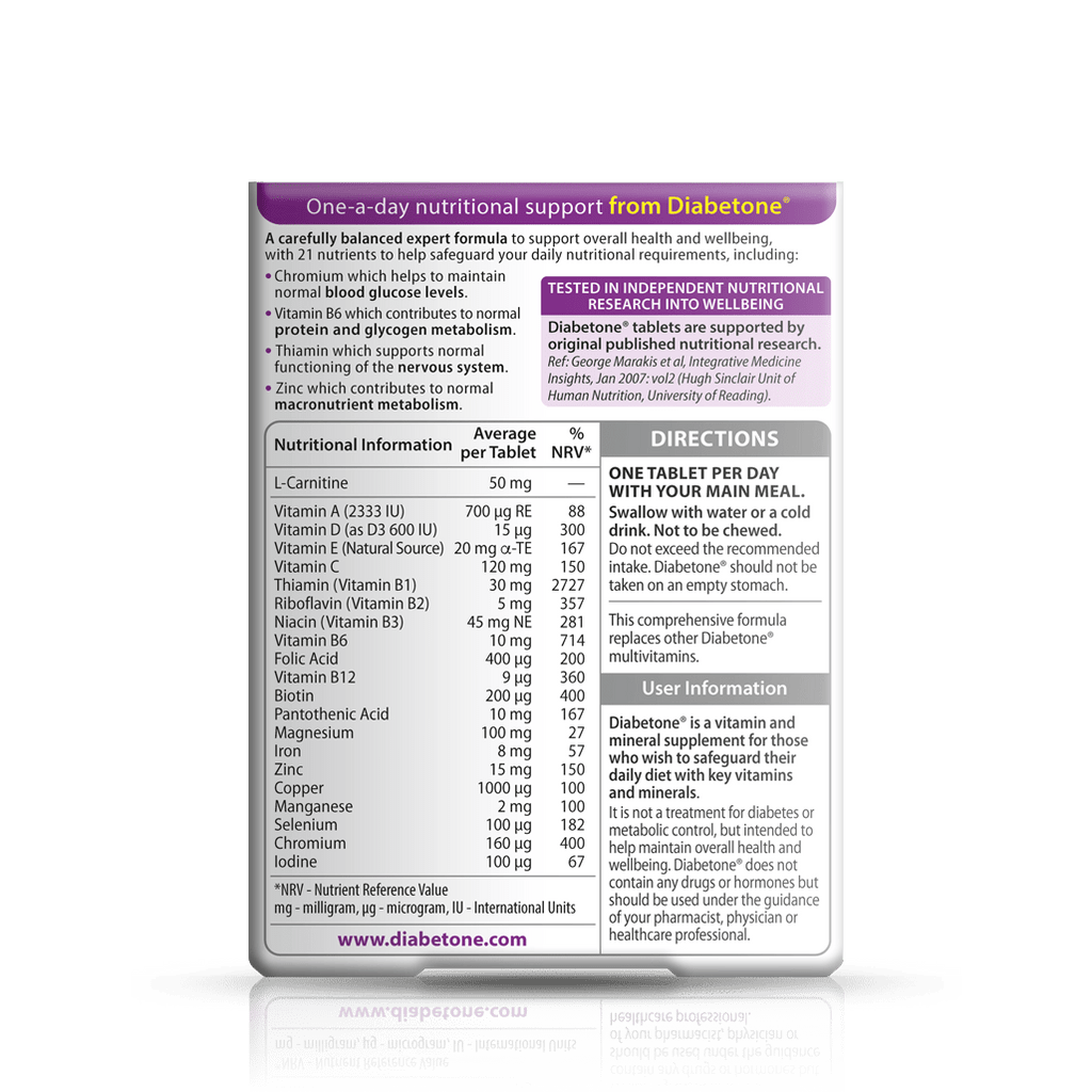 یک رژیم غذایی متعادل همیشه اساس سلامتی است - و دیابتون اورجینال منبع روزانه ۲۱ ماده مغذی ضروری از جمله کروم و ویتامین‌های گروه B برای شماست. فرمولاسیون ویژه آن که برای جامع بودن طراحی شده است، به این معنی است که نیازی به مصرف مولتی‌ویتامین دیگری ندارید.