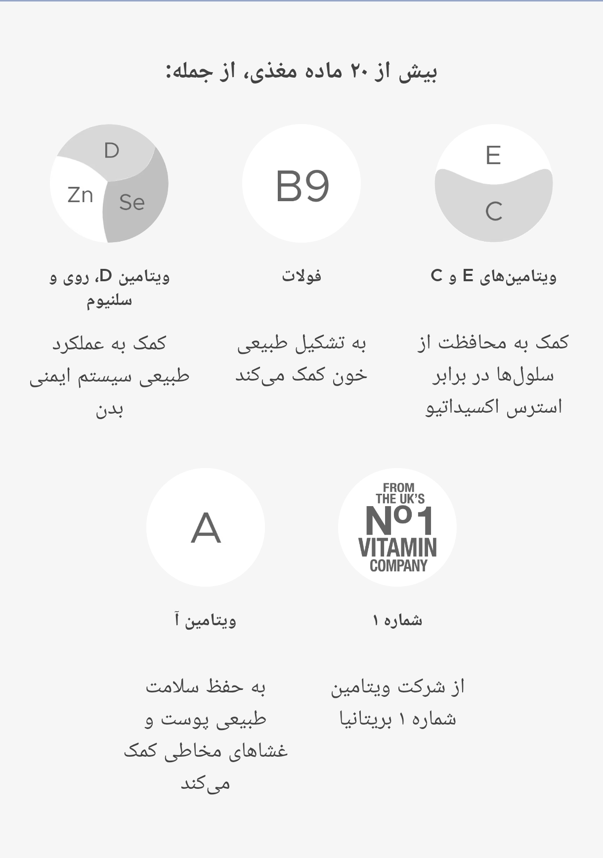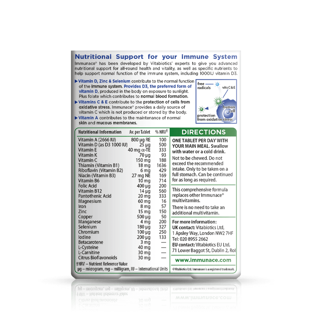 سیستم ایمنی سالم بخش کلیدی سلامت کلی شماست. اما Immunace Original فقط ویتامین D، روی و سلنیوم نیست. این یک مولتی ویتامین پیشرفته است که شامل بیوفلاونوئیدها، اسیدهای آمینه، به علاوه ویتامین‌های E و C نیز می‌شود که به محافظت از سلول‌ها در برابر استرس اکسیداتیو ناشی از رادیکال‌های آزاد و موارد دیگر کمک می‌کنند